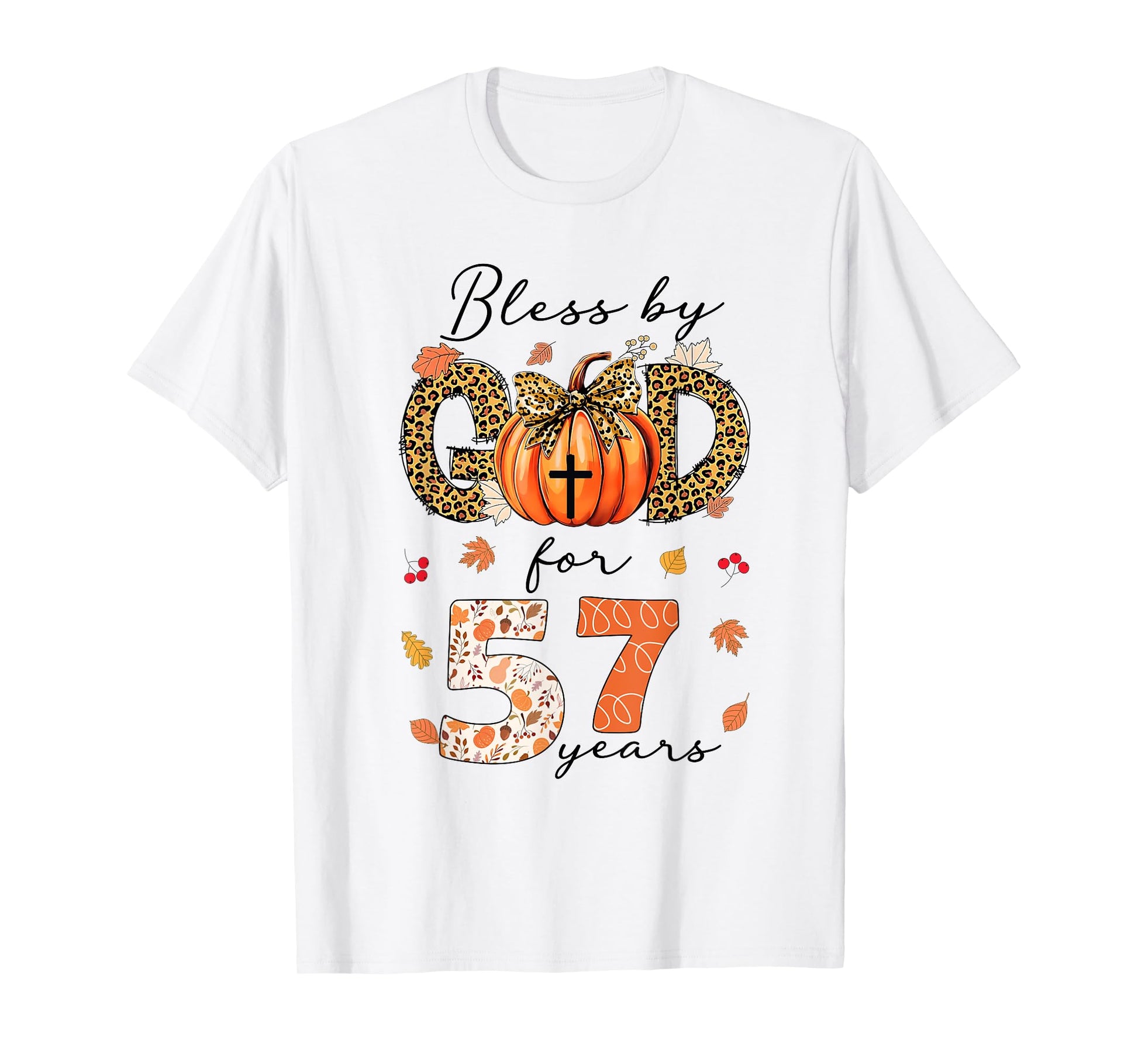 Blessed By God For 57 Years Old Woman Leopard Bow Pumpkin T-Shirt