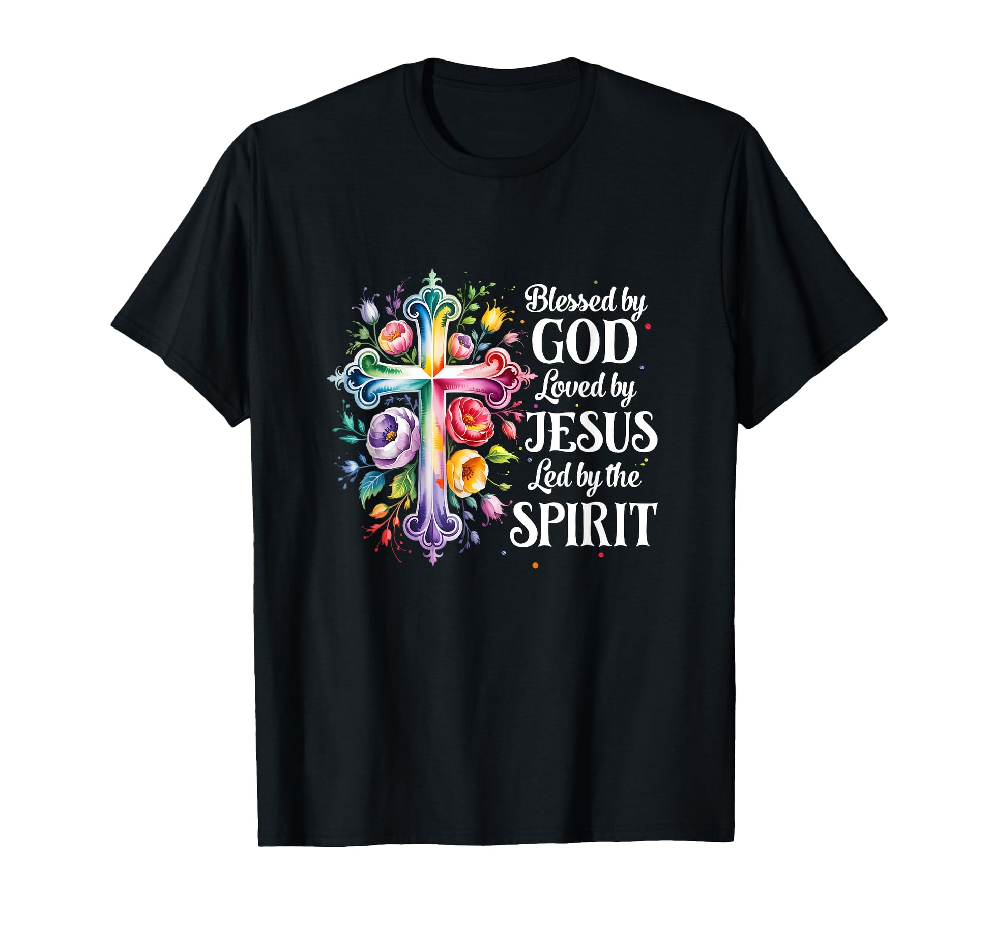 Blessed By God Loved By Jesus Flowers Cross Christian Women T-Shirt