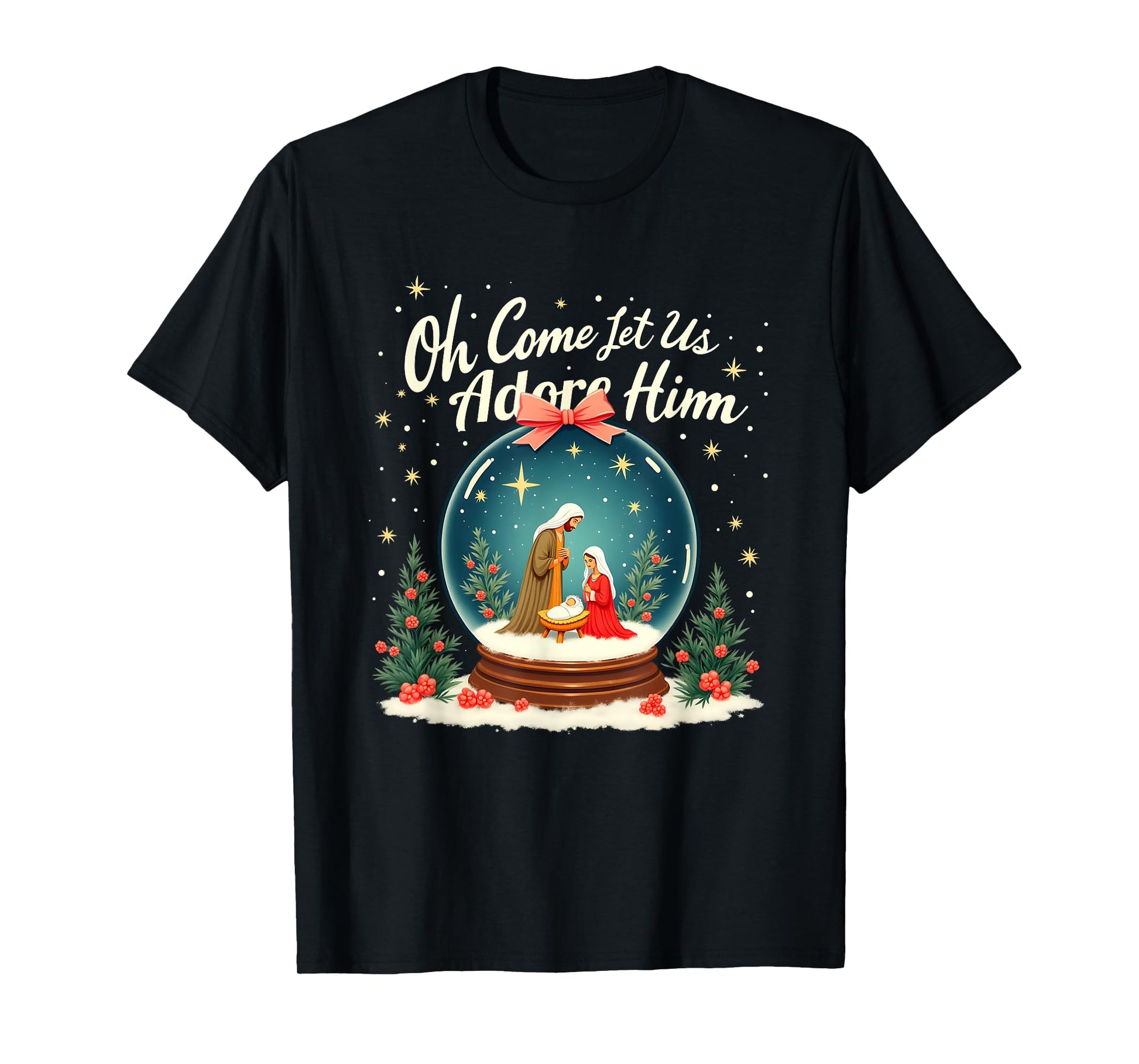 Christmas Nativity Scene Oh Come Let Us Adore Him Snow Globe T-Shirt