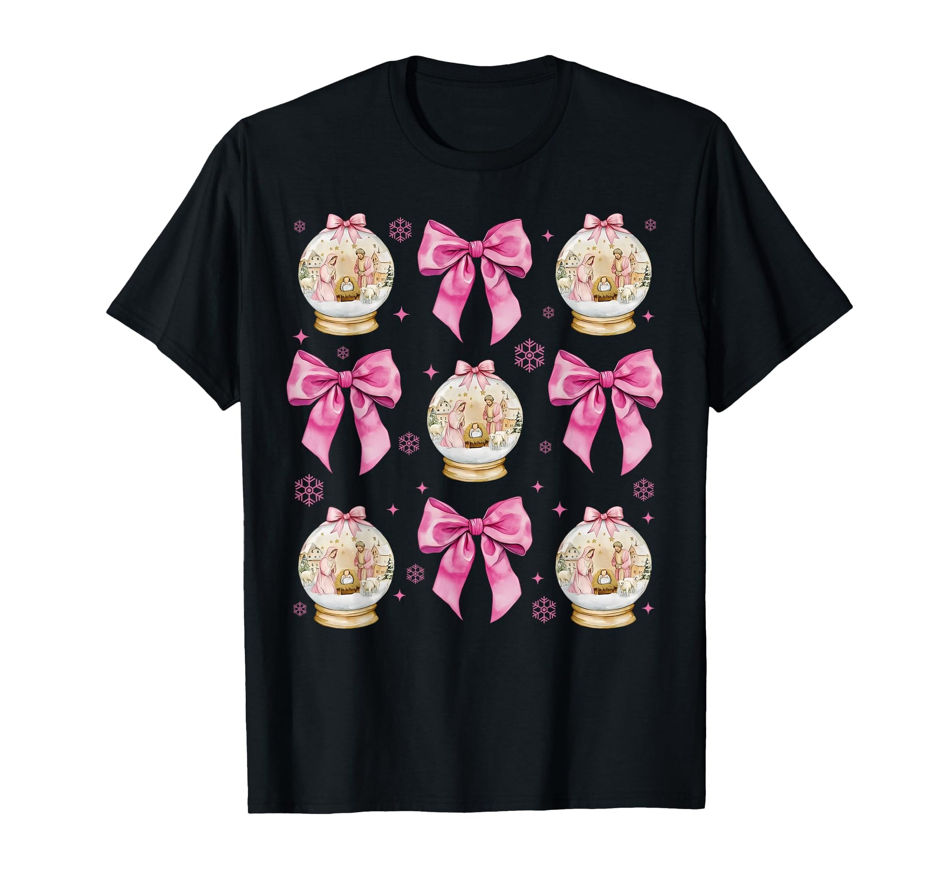 Jesus Nativity Scene Pink Coquette Bow Snow Globe Christian T-Shirt
