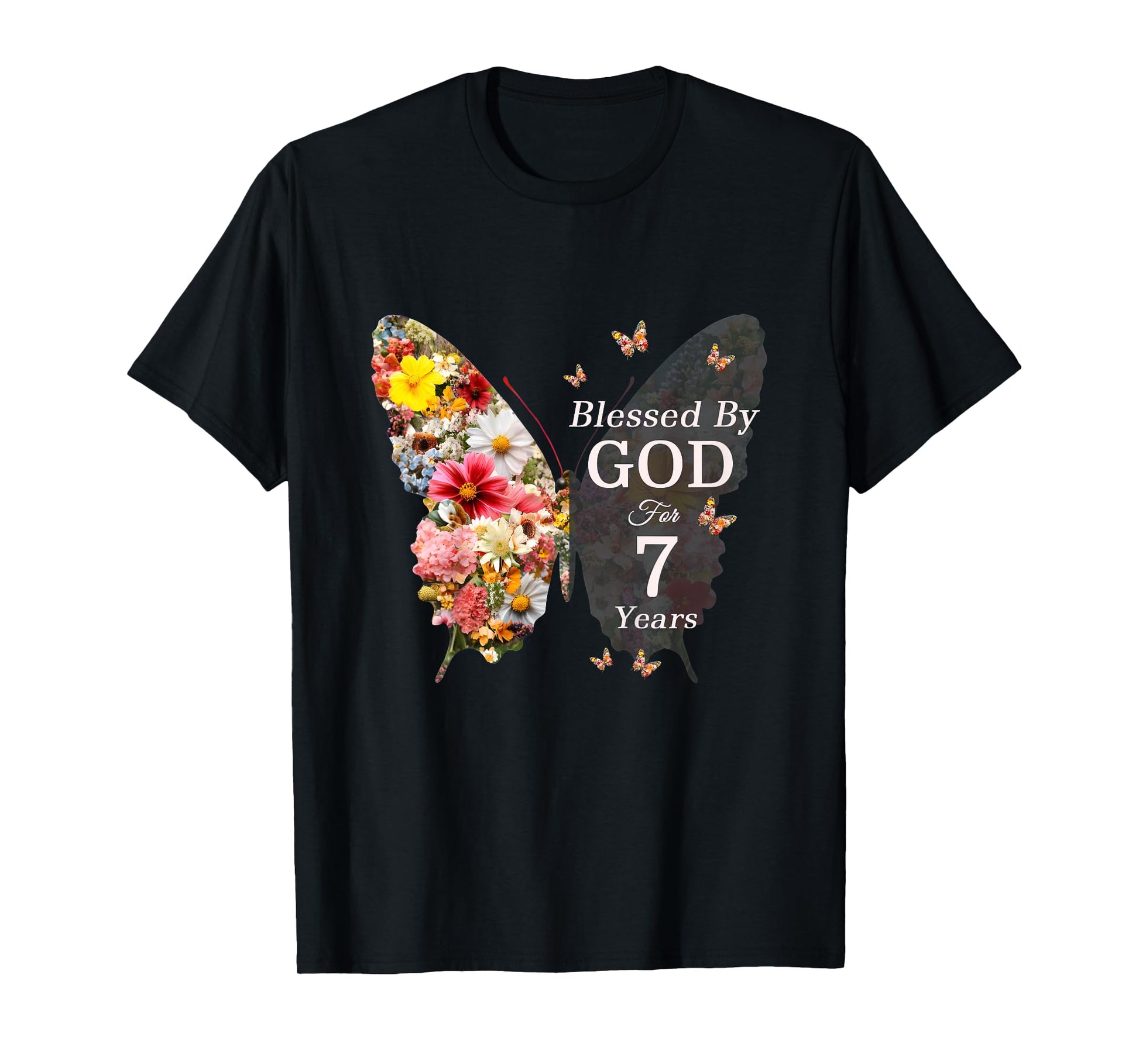 Kids Blessed By God For 7 Years Butterfly Flower 7th Birthday T-Shirt