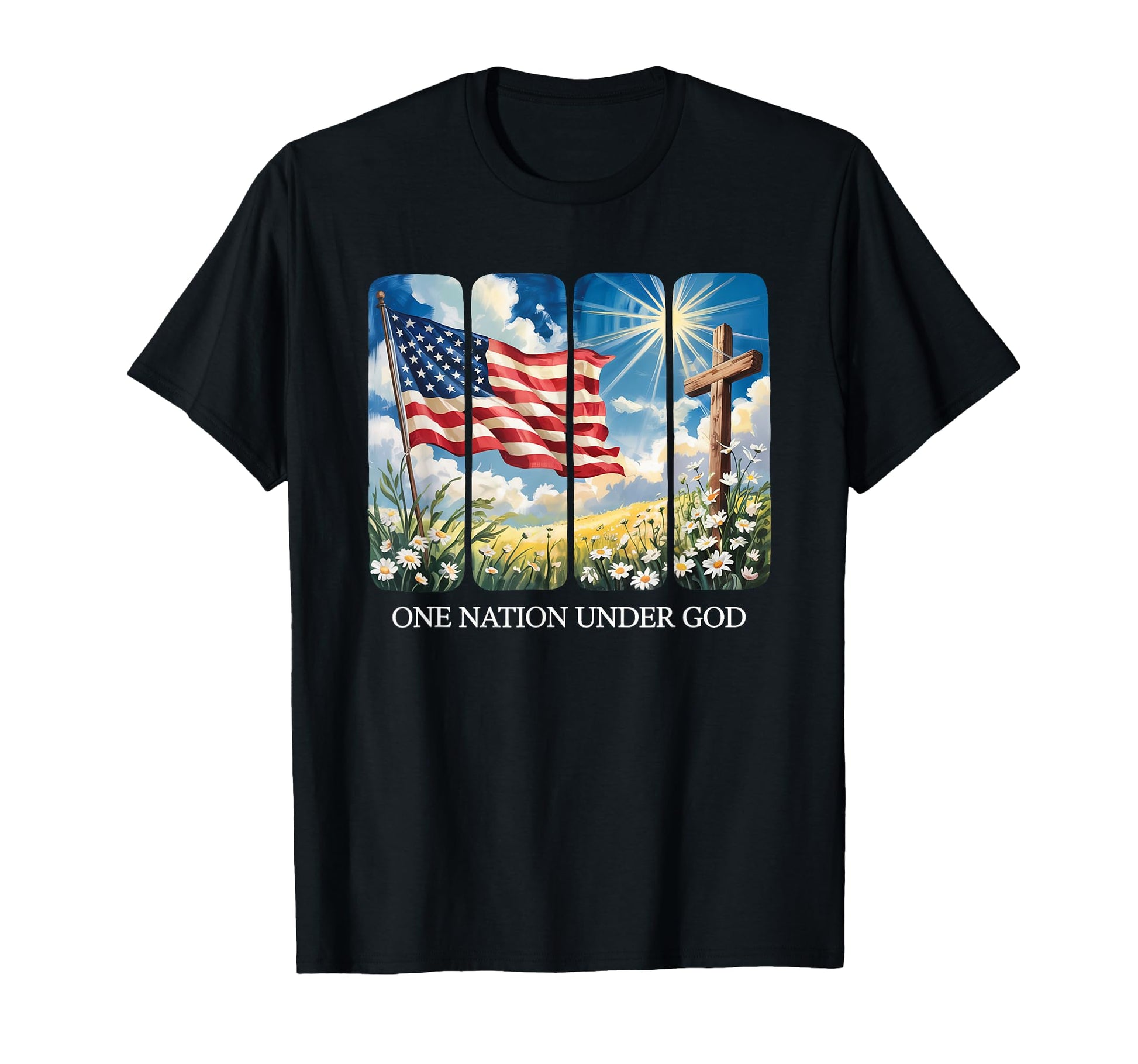 One Nation Under God USA Flag Cross Floral Christian Women T-Shirt