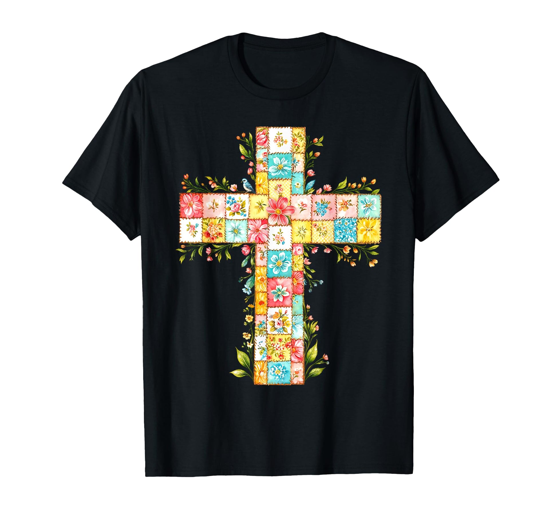 Vintage Floral Patchwork Cross Christian Faith Religious T-Shirt